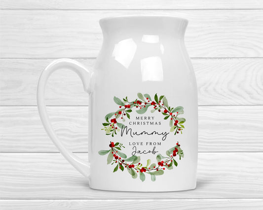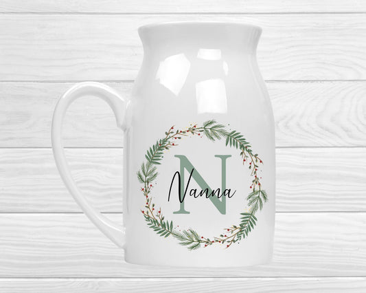 Personalised Christmas Vase - Nanny, Grandma, Nana Keepsake - Ceramic Flower Jug Gift - Xmas Wreath Name